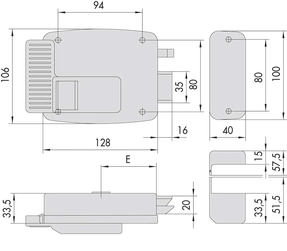 La serratura è prodotta in sei varianti, differenziate per entrata (E.) e verso di apertura: