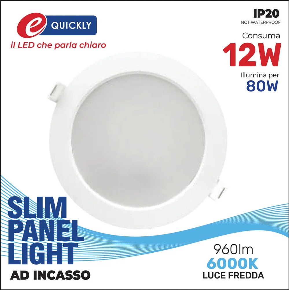 Faretto Slim Panel Tondo LED da Incasso 12W – Equivalente a 80W alogena, 960 lm, fascio 120°, disponibile in luce naturale 4000K o fredda 6000K. Design sottile Ø168 mm, foro di incasso Ø150 mm, ideale per interni.