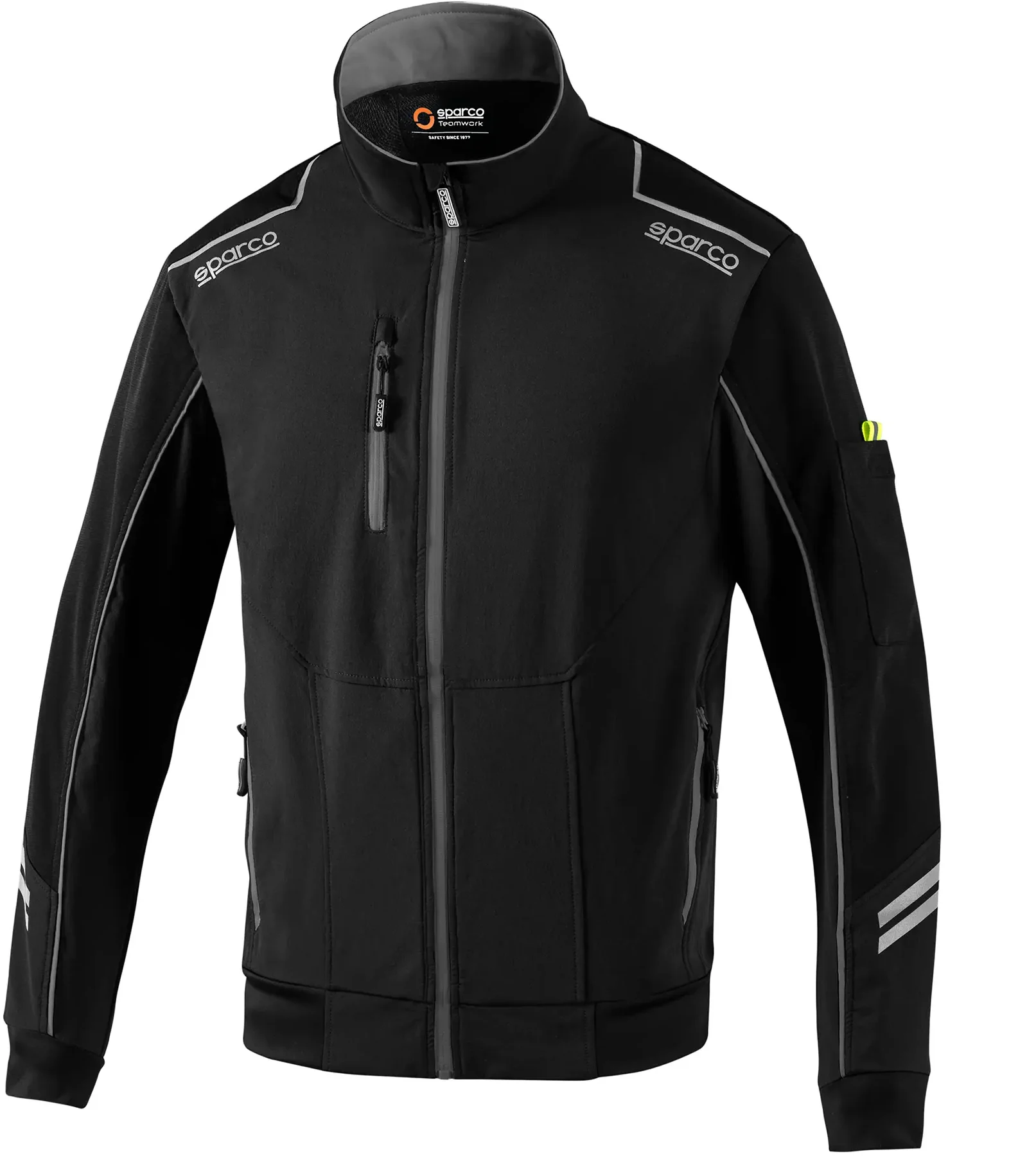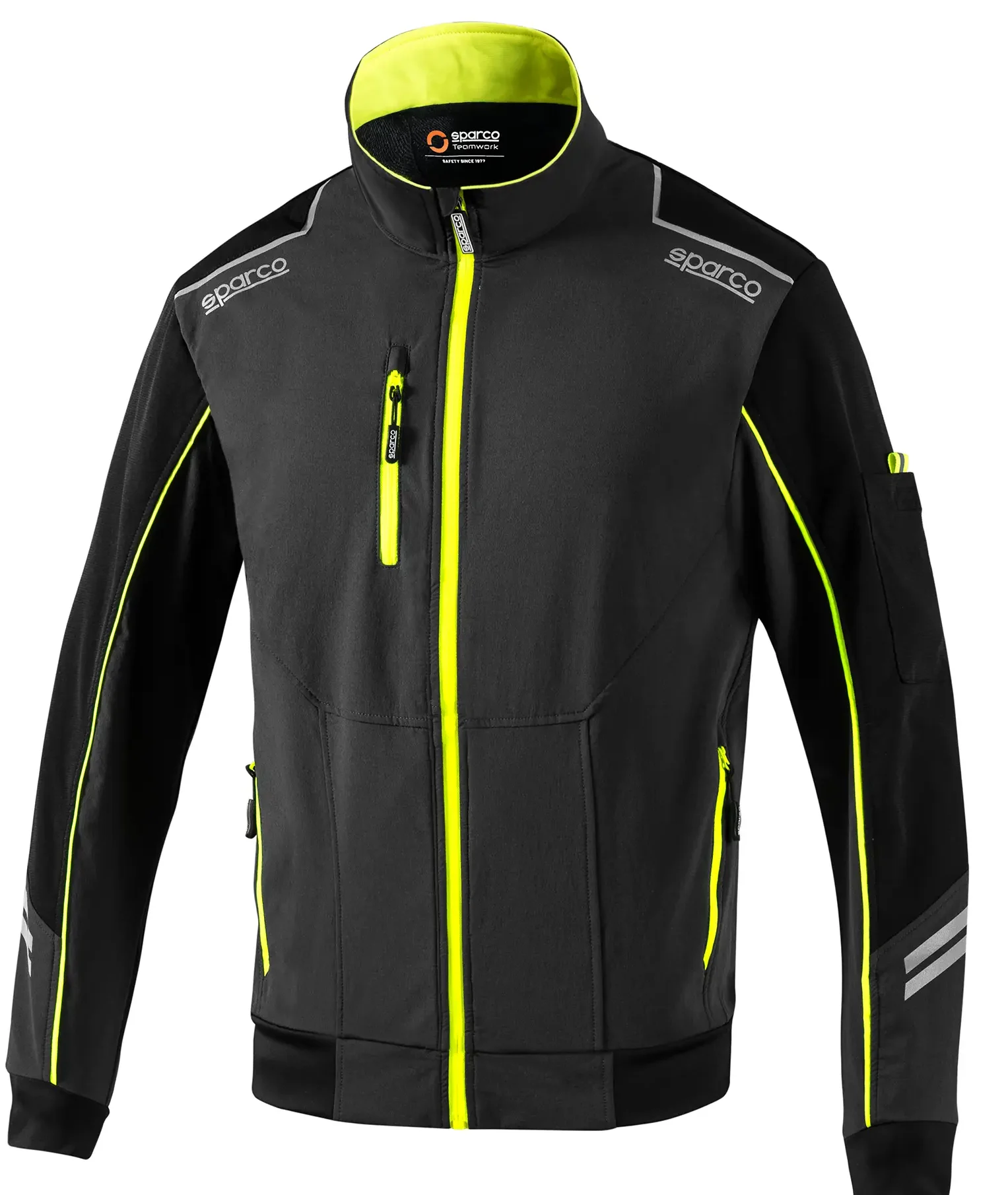 Le maniche rinforzate con inserti antiabrasione offrono una protezione aggiuntiva nelle zone di maggiore usura, mentre le strisce riflettenti ad alta visibilità aumentano la sicurezza in ambienti con scarsa illuminazione. La cerniera centrale spalmata impermeabile protegge efficacemente da vento e pioggia leggera, mantenendo il corpo asciutto e confortevole.
