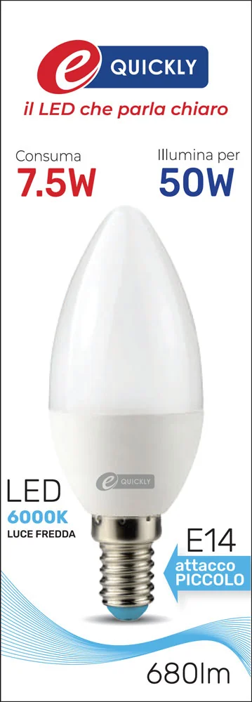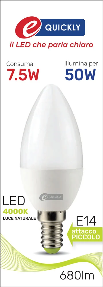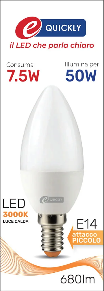 Lampada Candela C37 LED E14 7,5W, 680 lm, equivalente 50W, fascio 200°, disponibile 3000K / 4000K / 5000K.