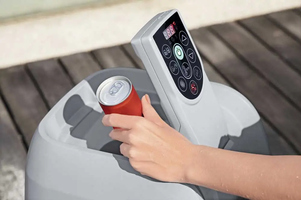 Comfort Integrato: La pompa multifunzione non è solo il cuore tecnologico della spa, ma offre anche un pratico vano per bibite e snack, per non dover mai interrompere il relax.