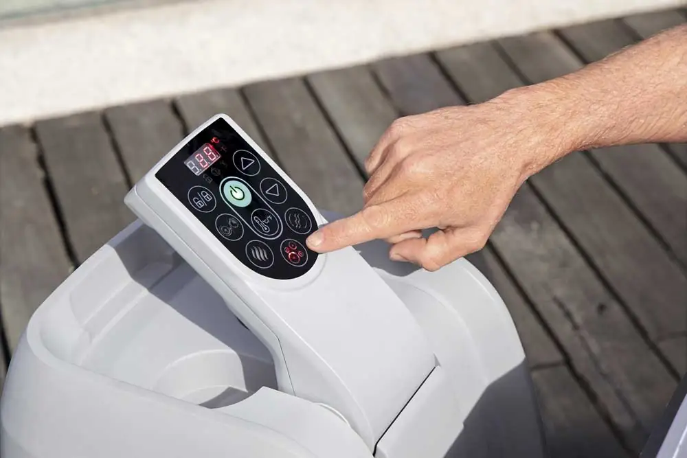 Controllo Digitale High-Tech: Il pannello di controllo, facilmente raggiungibile dall’interno della spa, permette di regolare la temperatura fino a 40°C e gestire tutte le funzioni con un semplice tocco.