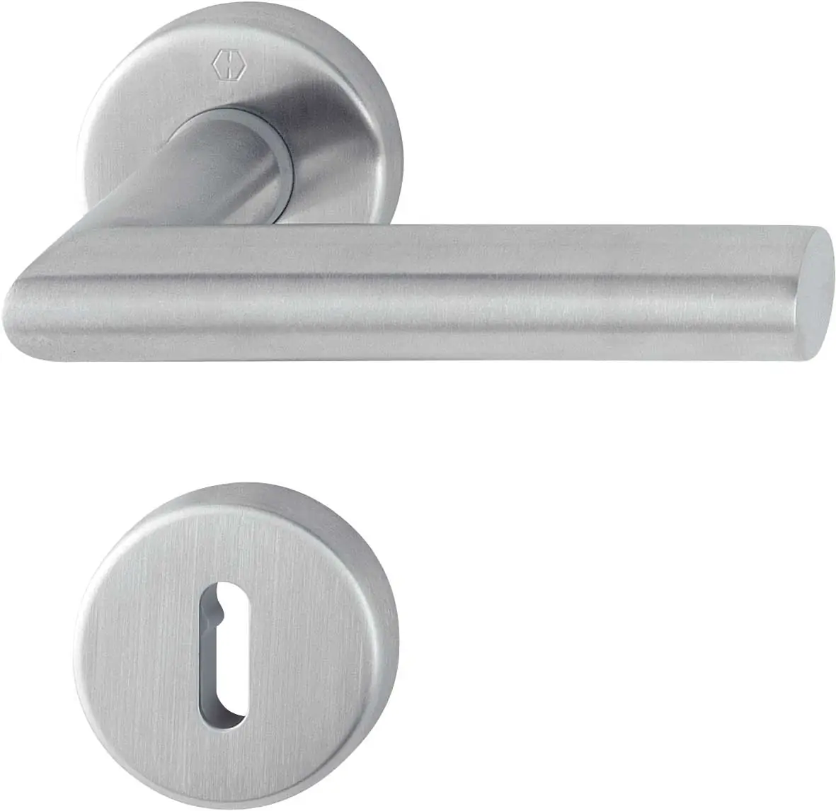 La maniglia Amsterdam HOPPE con foro patent in acciaio inox, completa di rosette e bocchette, rappresenta una soluzione resistente, funzionale e di design, combinando affidabilità certificata e estetica raffinata per porte interne.