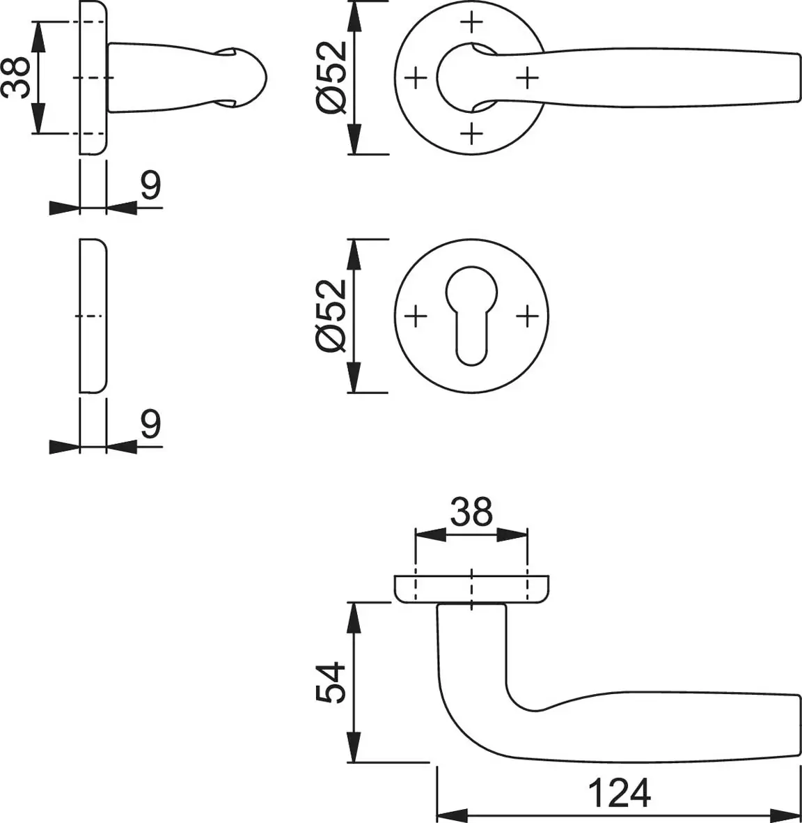 Guarnitura per porte interne con rosetta e bocchetta, versione fisso/girevole con molle di richiamo e anelli di guida esenti da manutenzione. Adatta a porte 35–75 mm, quadro HOPPE 8 mm, foro cilindro Yale. Confezione completa di coppia di maniglie, rosette e bocchette.