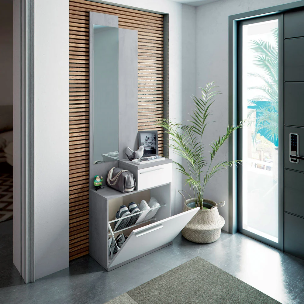 Mobile ingresso completo con specchio, 2 piani d’appoggio, 1 cassetto e vano scarpiera, ideale per organizzare ingressi in modo funzionale e ordinato. La finitura cemento e bianco Artik conferisce un aspetto moderno e luminoso, adatto a qualsiasi ambiente contemporaneo.