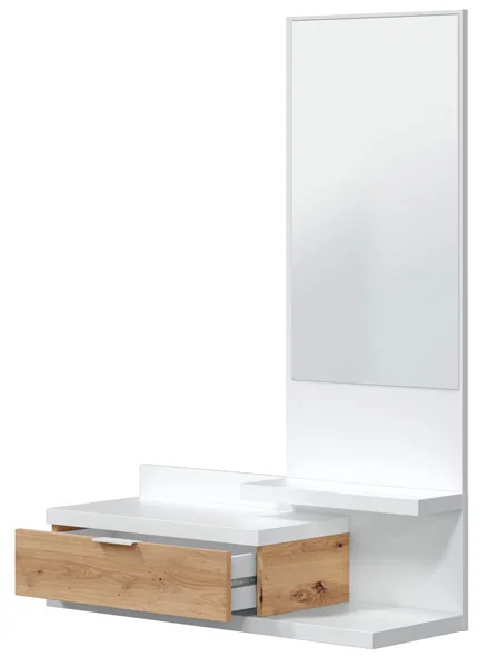 Mobile ingresso sospeso con specchio integrato e 1 cassetto, progettato per unire funzionalità e stile. La combinazione di finiture rovere nodi e bianco Artik conferisce calore e modernità all’ambiente, rendendo il mobile ideale per ingressi e corridoi. Il design sospeso facilita la pulizia del pavimento e dona leggerezza visiva all’arredo.