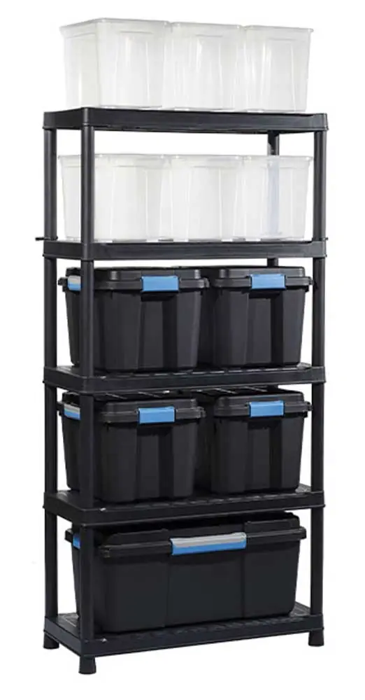 Ripiani: 5 ripiani con portata massima di 55 kg per ripiano, adatti a contenere scatole, attrezzi o prodotti domestici.
