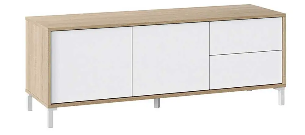 Il mobile dispone di 2 ante per riporre dispositivi elettronici, accessori o oggetti vari, e 2 cassetti per contenere telecomandi, cavi o altri piccoli oggetti, garantendo ordine e praticità. La struttura è stabile e resistente, studiata per supportare TV di diverse dimensioni e per organizzare al meglio lo spazio.