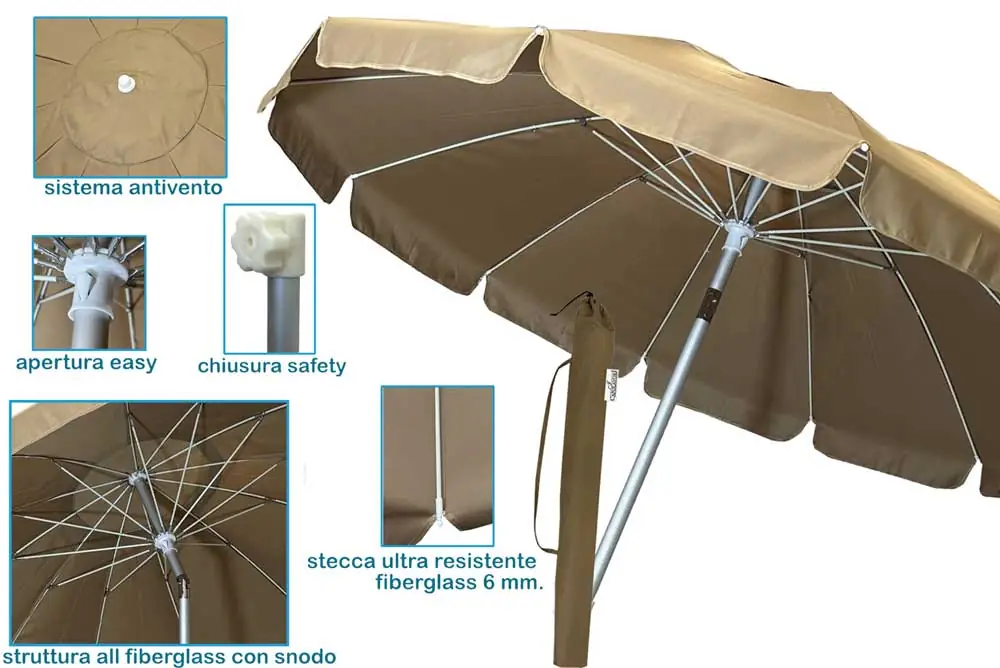 • Resistenza Superiore: A differenza dei comuni ombrelloni a 8 stecche, il nostro modello ne vanta ben 12 in fiberglass (6 mm). Questo materiale è ultra-flessibile e robusto: si piega con il vento ma non si spezza, evitando l’effetto “ribaltamento”.