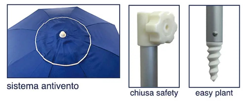 Sistema Air-Vent: Il pratico camino antivento sulla sommità permette il ricircolo dell’aria, riducendo l’effetto “vela” e aumentando la stabilità dell’ombrellone piantato nella sabbia.