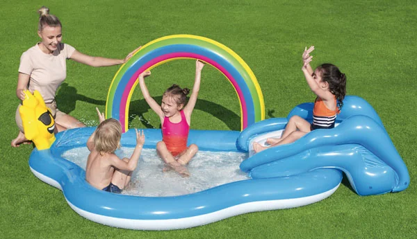 Il Play Center Arcobaleno è il parco acquatico gonfiabile perfetto per trasformare il giardino in un’area giochi dinamica e sicura. Caratterizzato da un design aperto e solare, questo play center combina una piscina spaziosa con uno scivolo colorato e un simpatico sole che funge da rinfrescante fontana, garantendo ore di divertimento attivo sotto il cielo estivo.