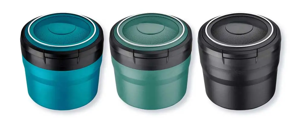 Chiusura a Scatto: Il coperchio superiore è progettato per chiudersi saldamente, intrappolando fumo e odori all’interno e garantendo che il contenuto non fuoriesca anche in caso di frenate brusche o curve strette.
