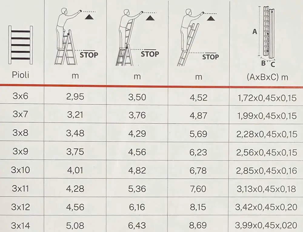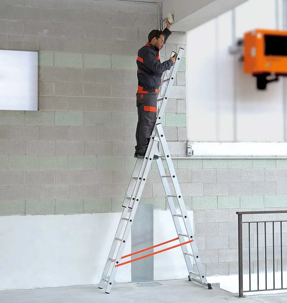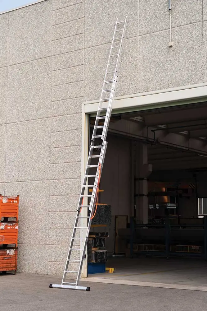 2. In Appoggio a Parete: Sfilando i tre tronchi si raggiungono altezze da record (fino a 7,96 metri nel modello 14 gradini), ideali per tetti, antenne e facciate industriali.