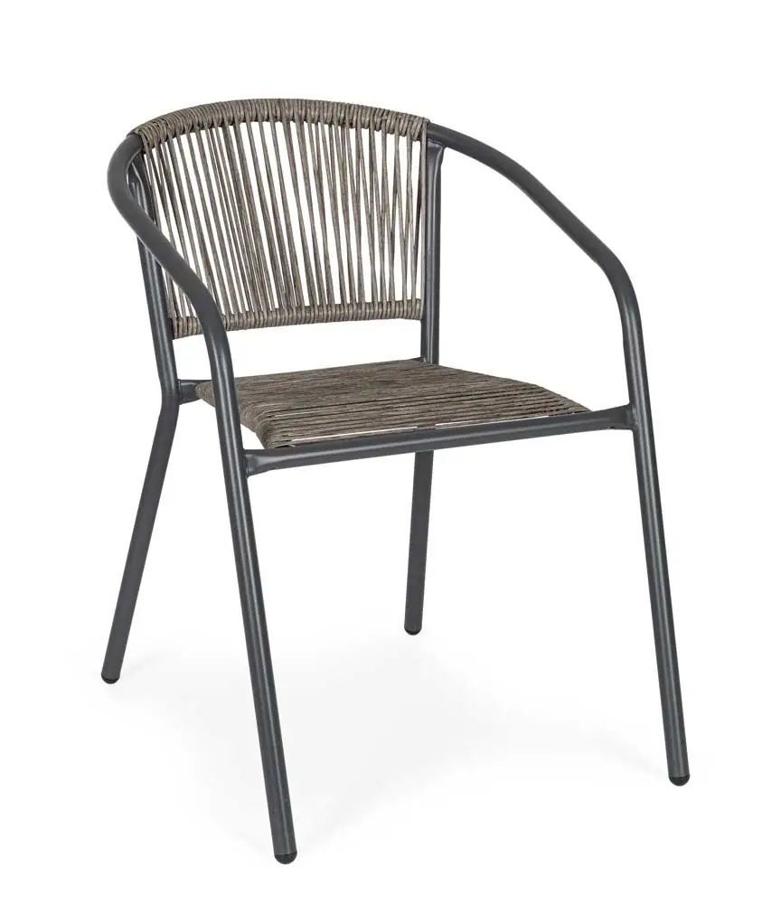 Il punto di forza della sedia Basilia è l’unione tra la solidità del metallo e l’elasticità del PVC intrecciato, che offre una seduta ergonomica e traspirante, perfetta anche per i pomeriggi estivi più caldi.