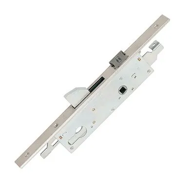 Serratura reversibile progettata per porte in alluminio, con possibilità di sostituzione del rullo tramite accessorio separato. Dotata di catenaccio con rinvii, garantisce chiusura sicura e affidabile.
