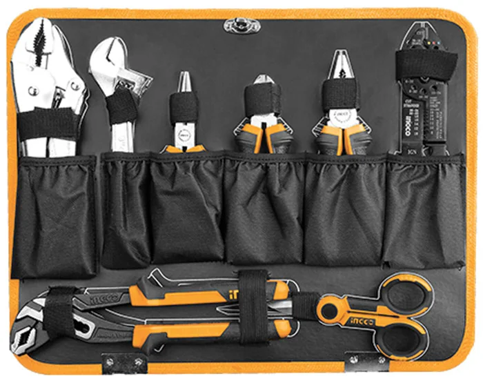 Set Pinze: Combinata (7″), Becchi lunghi (6″), Taglio diagonale (6″), Pinza a pompa (10″) e Chiave a rullino regolabile.