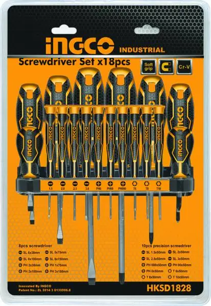 Set professionale da 18 cacciaviti INGCO, progettato per offrire massima versatilità in officina, manutenzione e lavori di precisione. Realizzati in acciaio Cromo-Vanadio (Cr-V), gli utensili garantiscono elevata resistenza, durata e affidabilità. Il kit include cacciaviti standard e di precisione, sia a taglio che a croce, oltre a punte Torx, coprendo così tutte le esigenze di lavoro meccanico ed elettronico.