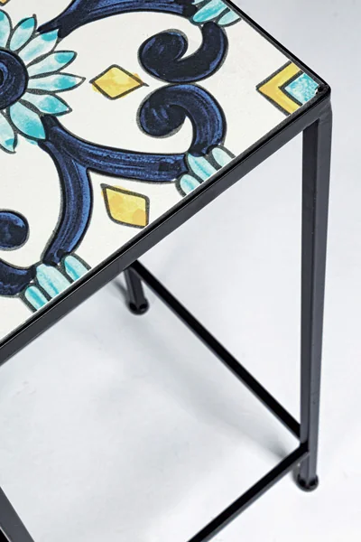Mosaico di Ceramica Autentica: Ogni ripiano quadrato è decorato con tessere di ceramica incastonate, creando un pattern geometrico o floreale tipico dello stile mediterraneo. La ceramica è un materiale “eterno” che resiste all’umidità dei vasi e non sbiadisce al sole.