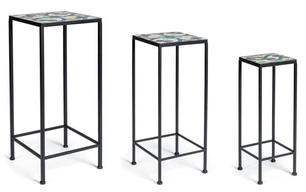 Questo set non è solo un complemento d’arredo, ma un sistema espositivo a scalare. Grazie alle tre diverse altezze, permette di creare giochi di volume dinamici, ideali per valorizzare piante, vasi di fiori, lanterne o sculture in angoli del giardino, verande o ingressi.