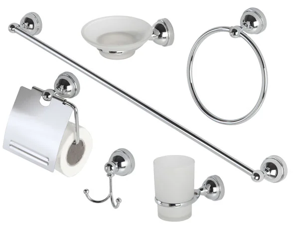 Set 6 accessori bagno cromo/vetro, completo, elegante e funzionale per un bagno ordinato.