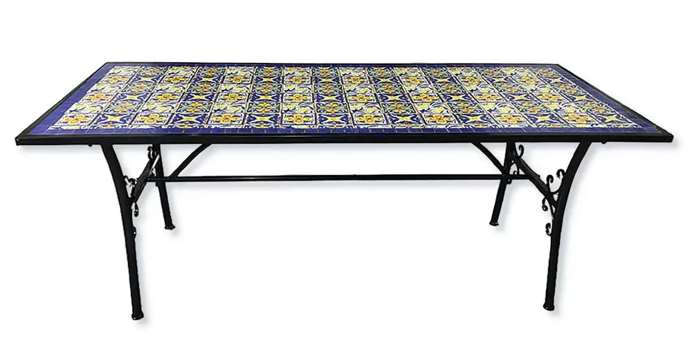 Con una superficie generosa di 160 cm di lunghezza e ben 90 cm di larghezza, questo tavolo è pensato per ospitare comodamente 6 persone, offrendo ampio spazio per piatti, decorazioni e portate centrali. Il piano in mosaico di ceramica blu trasforma il tuo giardino o la tua grande terrazza in un vero angolo di Sicilia o Costiera Amalfitana.