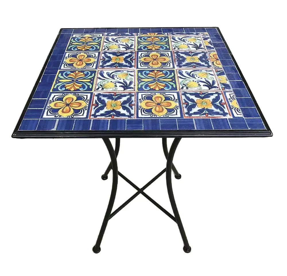 Il Tavolo Makari Quadrato 60x60 è la variante geometrica del classico modello tondo, pensata per chi predilige linee più nette o ha la necessità di accostare il tavolo a una parete per ottimizzare lo spazio sul balcone. Il piano in mosaico di ceramica blu incastonato nell'acciaio trasforma un semplice mobile da esterno in un piccolo capolavoro di design mediterraneo.