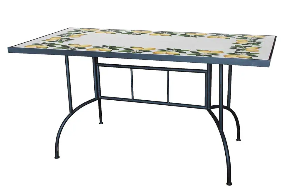 Con una lunghezza di 150 cm, questo tavolo accoglie comodamente 6 persone. Il piano non è una semplice stampa, ma un mosaico materico dove il giallo vibrante dei limoni e il verde delle foglie risaltano su uno sfondo ceramico che cattura la luce, donando profondità e prestigio a tutto l’arredo.