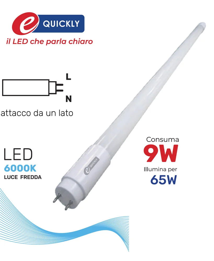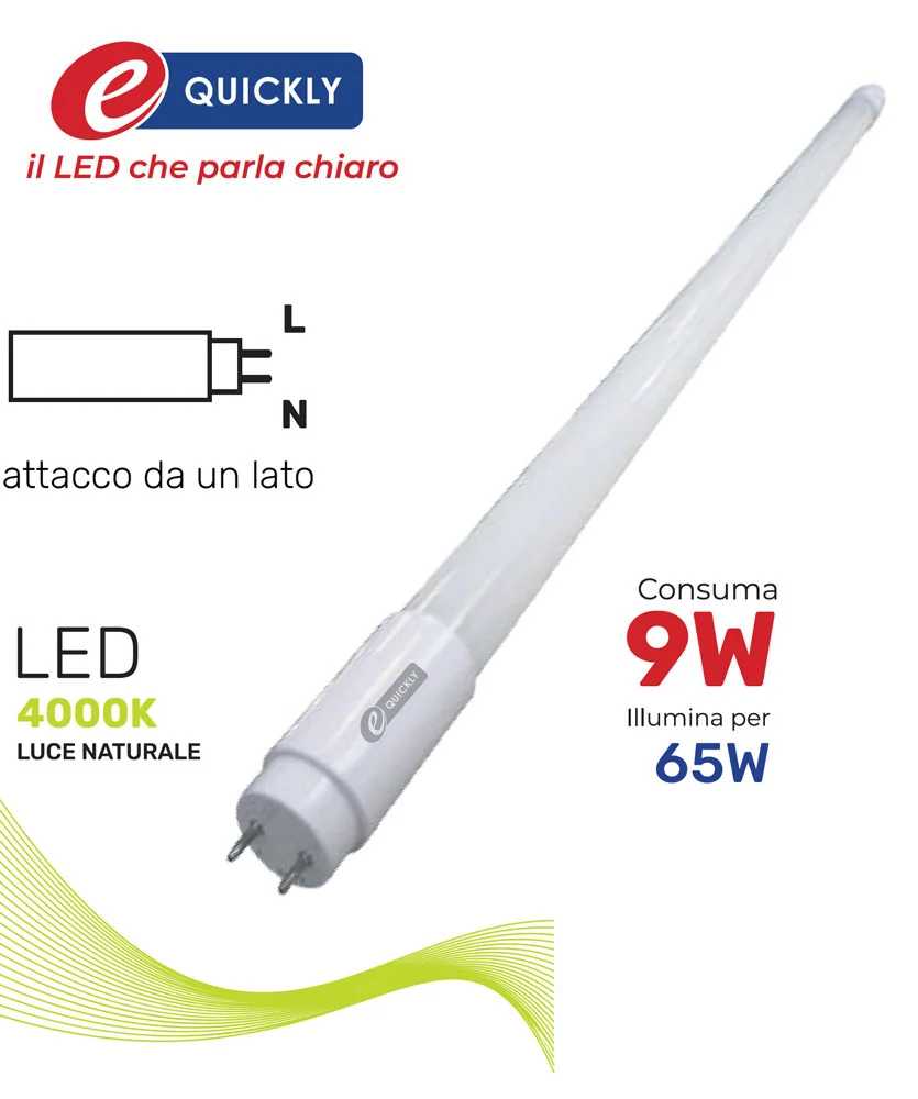 Tubo LED 60 cm – Linea Tubi LED – Potenza 9W, 810 lm, fascio 270°, luce naturale 4000K o fredda 6000K, attacco G13 lato singolo. Sostituisce tubi fluorescenti da 65W, ideale per interni.